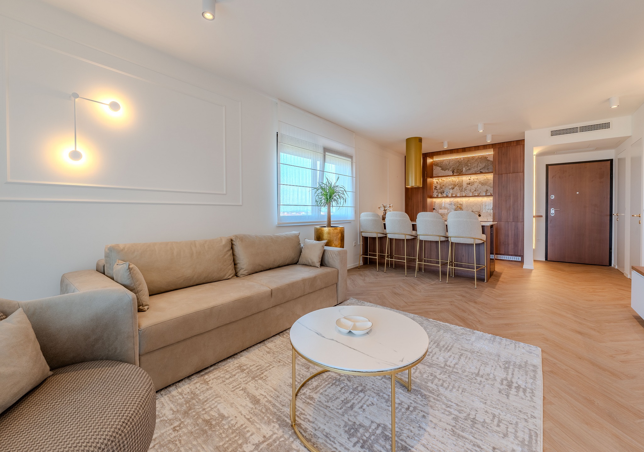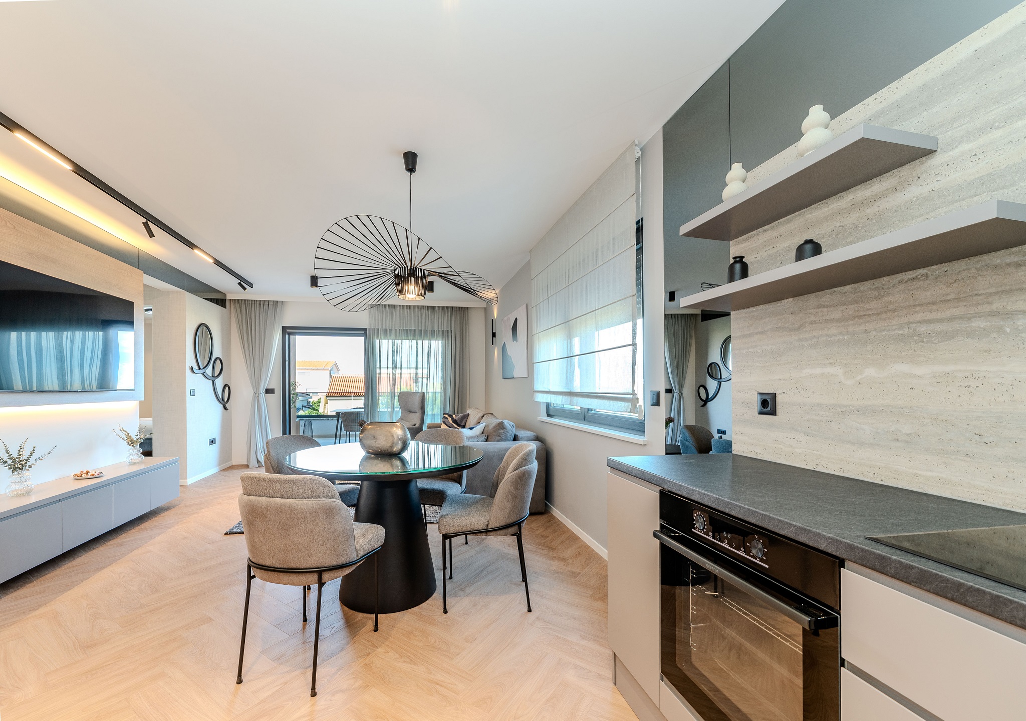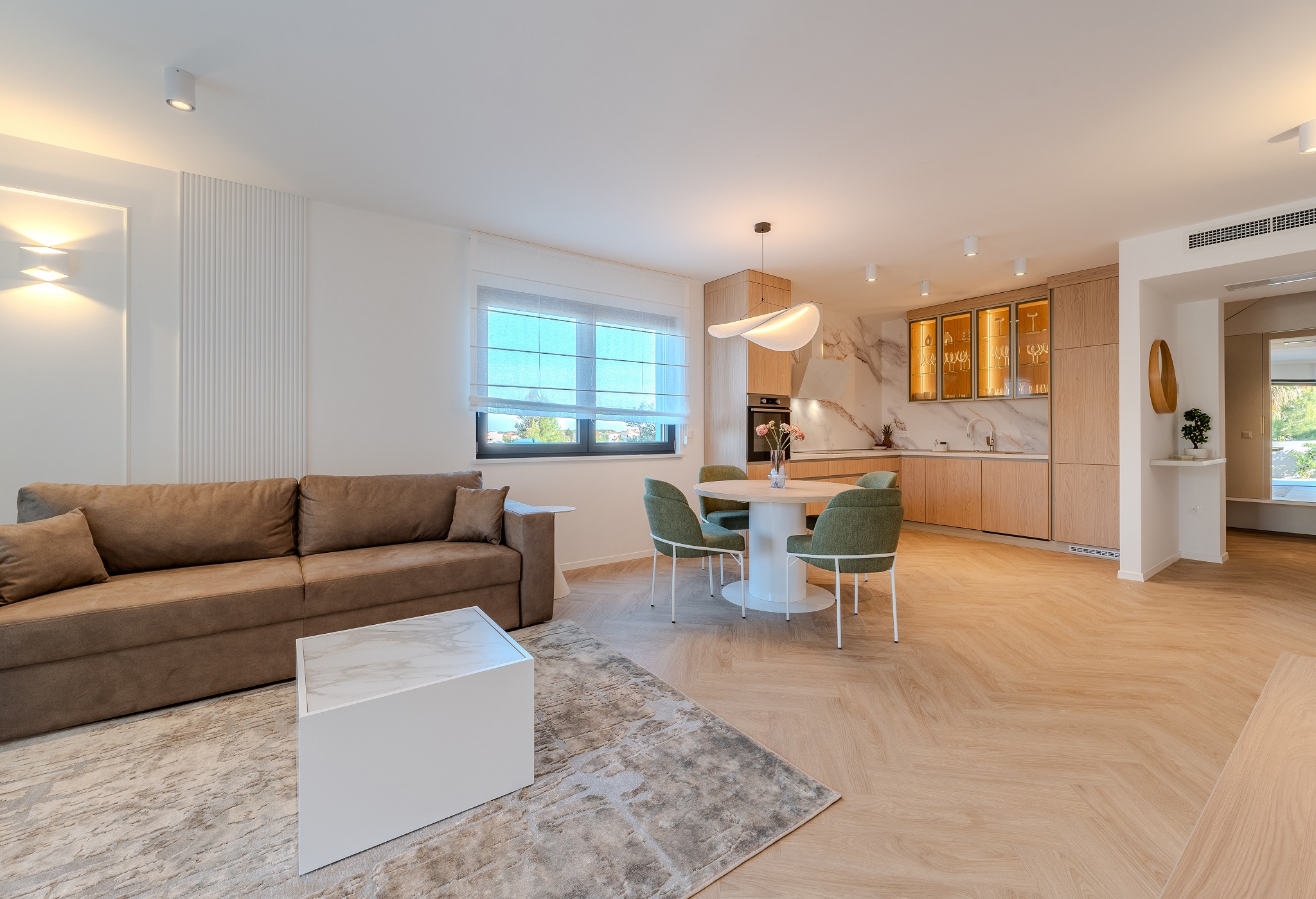 Izazov d.o.o. s ponosom predstavlja završetak projekta luksuznog opremanja Apartmana Vir. Svaki detalj interijera kreiran je s posebnom pažnjom, od ideje do realizacije, pružajući prostorima neponovljivu eleganciju i udobnost.
