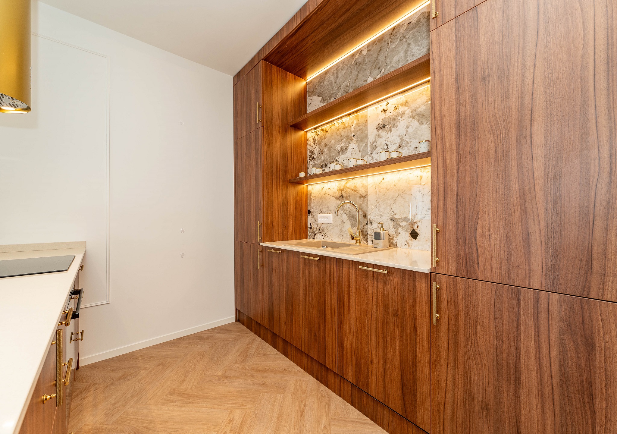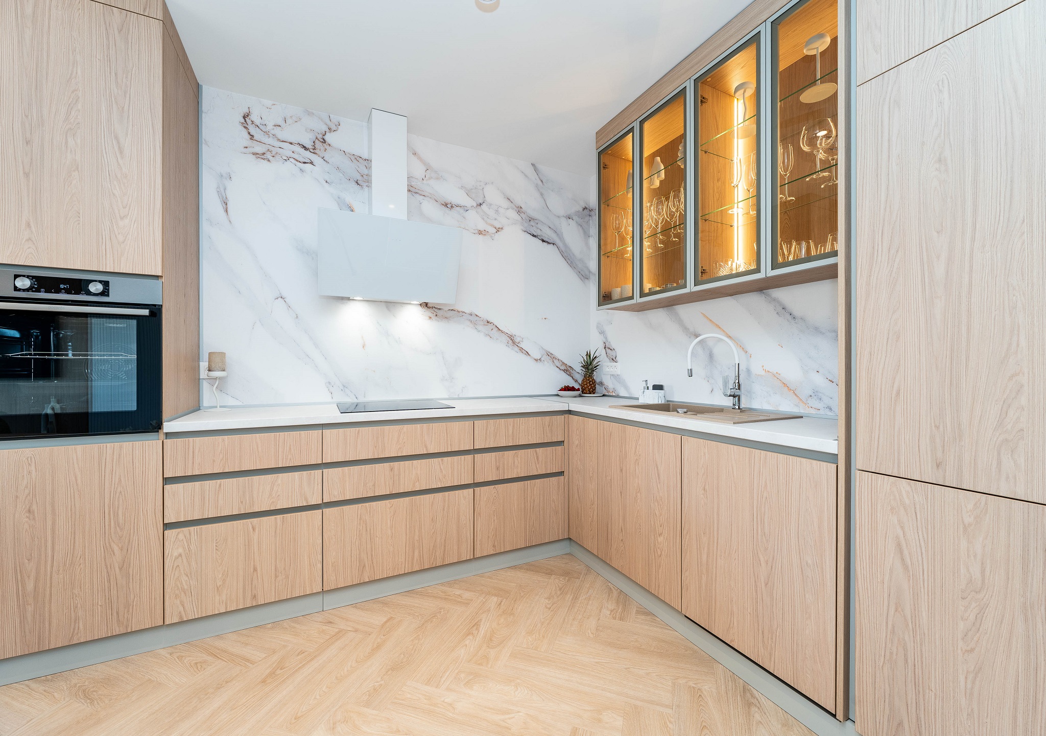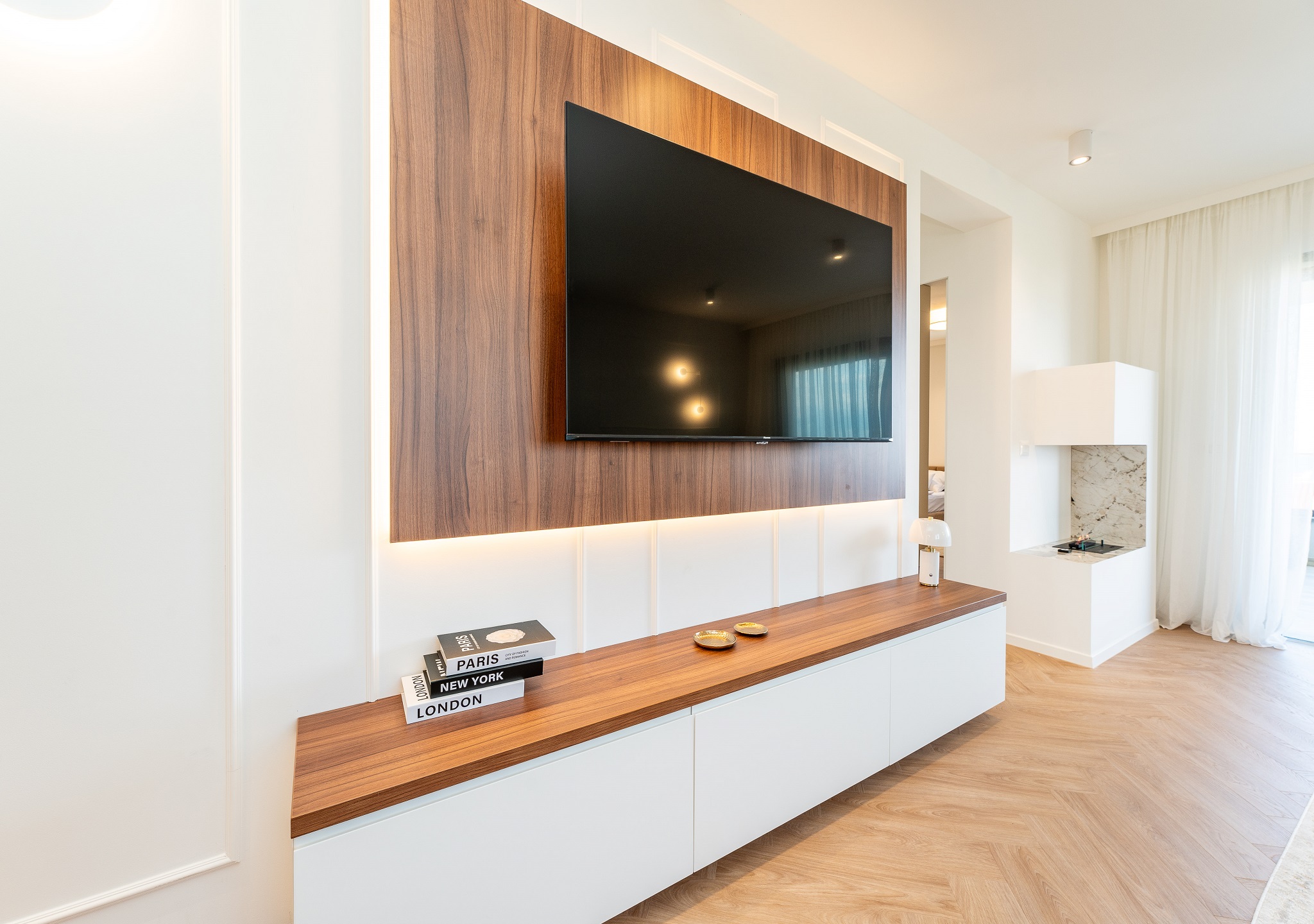 Kompletan namještaj izrađen je po mjeri, uz upotrebu vrhunskih materijala poput MDF-a, egger iverice i visokokvalitetnih tekstila. Svaki element pažljivo je osmišljen kako bi zadovoljio najviše estetske i funkcionalne standarde.